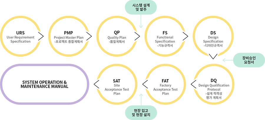 – 공급된 시스템이 고객의 요구사항과 FDA 그리고 cGMP의 표준에 따라 제작되고 시운전된다는 증명 서류인 설치 적격성 평가(IQ)와 운전